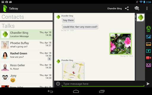 يعتبر برنامج Talkray من اجمل برامج المحادثات الصوتية ، و تستطيع من خلال تطبيق Talkray ان تقوم بالاتصال الصوتى باحد أصدقائك و كذالك ارسال الرسائل و رسائل فيديو مصورة ، و تستطيع تحديد موقعه عن طريق البرنامج ، تستطيع انشاء جروب من 25 صديق فى ان واحد و وجود امكانية أخفاء الاعلانات المزعجة التى تظهر ، برنامج Talkray سهل و بسيط و مجانى .