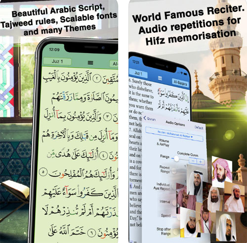 تلاوات القراء المعروفون عالميا ، إمكانية إختيار الثيمات (أخضر ، أزرق ، الوضع الليلي ، فاتح ، بني) ، أوقات الصلاة لجميع أنحاء العالم مع خيار تنبيه الأذان ودعم طرق مختلفة لحساب أوقات الصلاة وبوصلة القبلة وأوقات السحور والإفطار ، خيار عرض أي ترجمة مع النص العربي ، ميزة بحث متقدم يساعد في البحث عن أي كلمة ، وضع علامة مرجعية على الأية والترجمة والتفسير للرجوع إليها ، واجهة مستخدم للغة العربية وللغات الأخرى ، تظليل الآية والكلمة أثناء التلاوة ، دعم تشغيل التلاوة في الخلفية وغيرها الكثير.